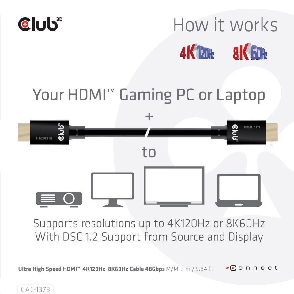 CAC-1373 -The Club 3D Ultra High Speed HDMI™ Cable is build to handle the highest quality video- and audio signals. HDMI™ has an increased Bandwidth of 48Gbps. The increase in maximum bandwidth compared to previous versions is achieved by increasing both the Bitrate of the data channels (from 6Gbps to 12Gbps) and the number of channels (from 3 to 4). This allows support for resolutions up to supports 10K at 120Hz!