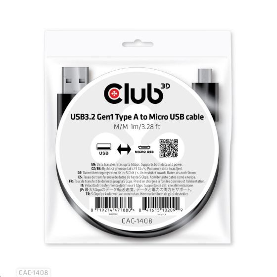 CAC-1408 - The Club 3D USB 3.2 Gen1 Type-A to Micro USB Cable enables the connection of your existing USB Type A output connections, Laptops, tablets and Ultrabooks, Power Chargers, etc. to Micro USB inputs, like camera's, Phones and our range of extension cables and adapters.