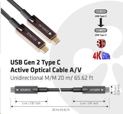 The Club 3D CAC-1589 USB Gen 2 Type C AOC cable enables the connection of your Notebook, Tablet or Phone with USB Type C output to the latest USB C Peripherals and Accessories. It offers Video and Audio over a single 20 m/ 65.62 ft cable.