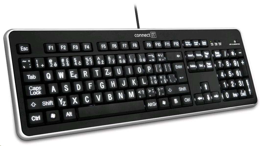 Novou LED podsvícenou klávesnici CONNECT IT s velkým fontem ocení nejen uživatelé s horším zrakem, ale i každý, kdo pracuje v šeru a vecerních hodinách. Cerný povrch se stríbrným lemováním dodává klávesnici elegantní vzhled. Vlastnosti: - české rozložení kláves - velký font kláves pro pohodlné psaní - bílé podsvícení pomocí LED diod pro použití v šeru a tmě - tlačítko pro vypnutí podsvícení - matný povrch klávesnice - kompatibilní s USB 1.1 a 2.0 - délka kabelu: 140 cm.