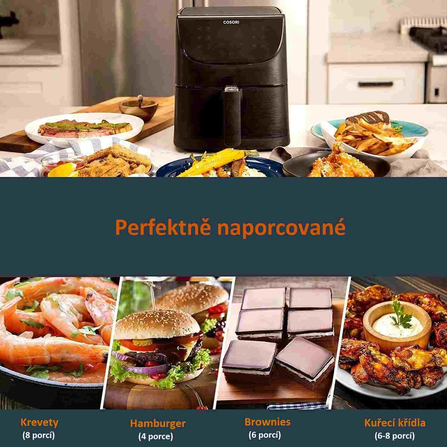S horkovzdušnou fritézou COSORI CP158-AF PREMIUM si můžete užít vaše oblíbená smažená jídla bez výčitek, protože na rozdíl od běžného smažení nebo fritování je možné v ní připravovat jídla za použití velice malého množství oleje a nebo vůbec žádného. Kombinace cirkulujícího horkého vzduchu, dokonalé teploty vaření a chytrých programů zajistí, že hranolky budou vždy krásně křupavé a kuřecí stehna šťavnatá. Ať už je vaše jídlo čerstvé nebo mražené, stisknutím tlačítka můžete horkým vzduchem smažit kuřecí křídla, kuřecí prsa, sladké brambory, steaky, čerstvé hranolky a mnoho dalšího. Až budete mít hotovo, čištění bude stejně snadné díky nepřilnavému koši, který lze mýt v myčce. Díky veliké nádobě s objemem 5,5l navíc dokážete rychle navařit i pro větší rodinu nebo skupinu hostů.