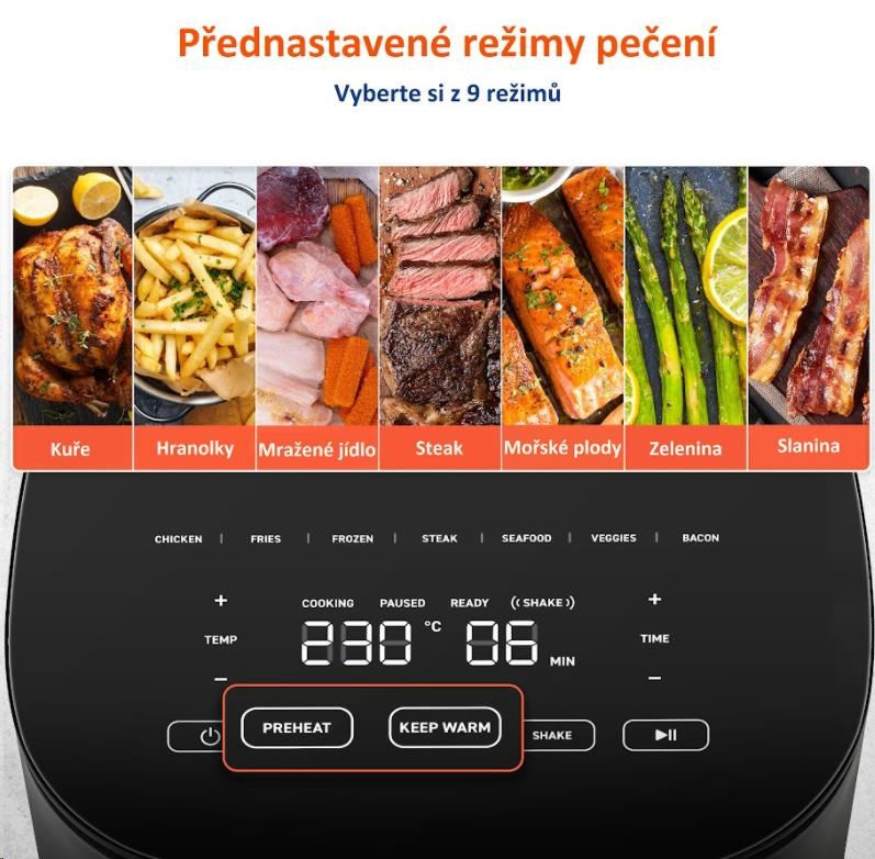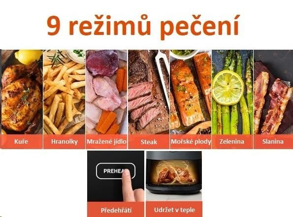 9 předvolených nastavení lze navolit jednoduše přímo na dotykovém LED displeji. Připravte skvělé pochoutky nebo své oblíbené jídlo jako ti nejlepší šéfkuchaři pouhým stisknutím tlačítka, a vy se můžete věnovat jiným věcem.
