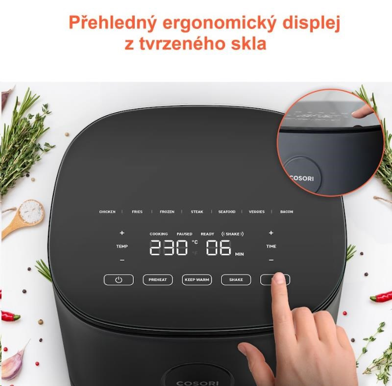 S horkovzdušnou fritézou COSORI CAF-L501-KEUE si můžete užít vaše oblíbená smažená jídla bez výčitek, protože na rozdíl od běžného smažení nebo fritování je v této fritéze možné připravovat jídla za použití velice malého množství oleje nebo vůbec žádného. Kombinace cirkulujícího horkého vzduchu, dokonalé teploty vaření a chytrých programů zajistí, že hranolky budou vždy krásně křupavé a kuřecí stehna šťavnatá. Ať už je vaše jídlo čerstvé nebo mražené, stisknutím tlačítka můžete horkým vzduchem smažit kuřecí křídla, kuřecí prsa, sladké brambory, steaky, čerstvé hranolky a mnoho dalšího. Až budete mít hotovo, čištění bude velice snadné díky nepřilnavému koši, který lze mýt v myčce. Díky nádobě s objemem 4,7l navíc dokážete rychle navařit i větší porce jídla.