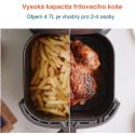 Horký vzduch rotuje kolem jídla ze všech stran a tím dosahuje kvalitního a rovnoměrného propečení a uvaření pokrmů. Díky této technologii se fritéza předehřeje během pouhých 5 minut.