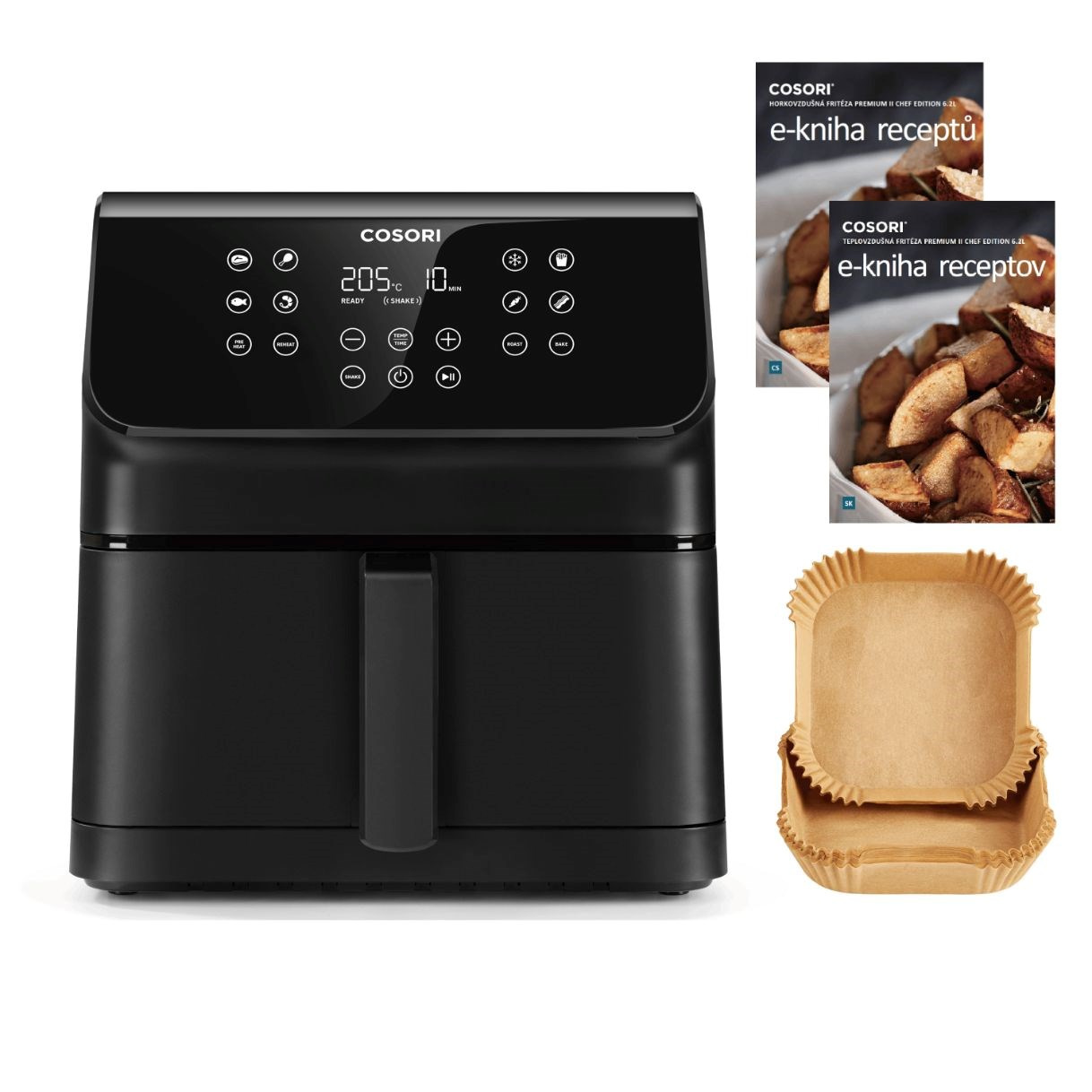 Představujeme horkovzdušnou fritézu Cosori Premium II. Inovované řešení, které nejen šetří čas, ale také energii a nabízí způsob vaření, který je šetrný ke zdraví. S horkovzdušnou fritézou si můžete užívat oblíbená jídla připravovaná s minimem oleje, vyhnete se zápachu ze smažení a také úklid je díky možnosti mýt koš v myčce hračkou. Fritéza nabídne koš se štědrým objemem 6,2 litrů, takže v ní je možné pohodlně připravit jídlo pro 3-5 lidí, například celé, 2,3 kg kuře. Při vysoké objemu si ale zachová malé vnější rozměry, takže se hodí i do malých kuchyní. S technologií 360° cirkulujícího vzduchu se fritéza zahřeje na provozní teplotu do 5 minut a dále výrazně zkracuje dobu vaření. Malý objem také znamená malou spotřebu energie ve srovnání s běžnou troubou. Fritéza nabídne 12 programů pro přípravu pokrmů, které je možné upravit podle individuálních chutí. Displej fritézy je přehledný a pohodlně nakloněný pro perfektní čitelnost. V dnešní digitální době je také poměrně atraktivní funkce vypnutí zvuku tlačítek. Jako bonus si můžete stáhnout e-kuchařku s 80 recepty v češtině i slovenštině a v balení najdete 50 ks papírových pečících forem.