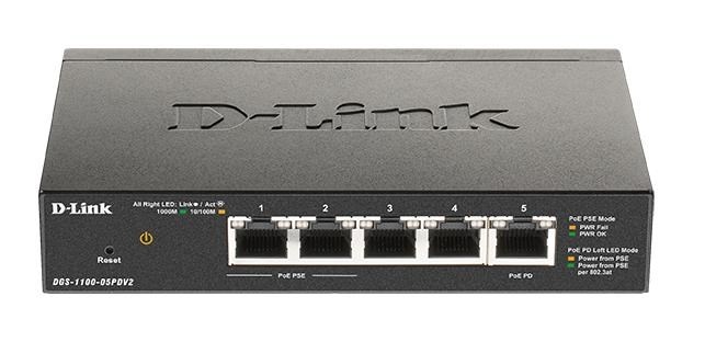 Popis D-Link DGS-1100-05PDV2 5-Port Gigabit PoE Smart Switch, bez zdroje - napájen přes PoE, 2 PoE porty