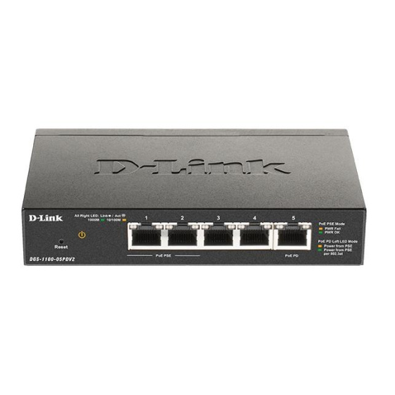 5-Port Gigabit PoE Smart Managed Switch with 1 PD port - 3 x 1000Base-T Auto-Negotiating 10/100/1000Mbps - 2 x 1000Base-T PoE Auto-Negotiating 10/100/1000Mbps - Ports 1 to 2 are PoE enabled, port 5 is PD port - Pass through 18W with 802.3at - DGS-1100-05PD has NO power adapter. - Port 1 and 2 are PoE port, Port 5 is PD port - Fanless - 802.1Q VLAN - Static voice VLAN - Surveillance VLAN - 802.1p QoS - IGMP snooping - Loopback detection - Port mirroring - Bandwidth control - Storm control - TLS1.1/1.2 - PoE PD alive - Dual Images - Link Aggregation - SNMP - 802.3, 802.3u, 802.3x - Web based management - Cable diagnostics.
