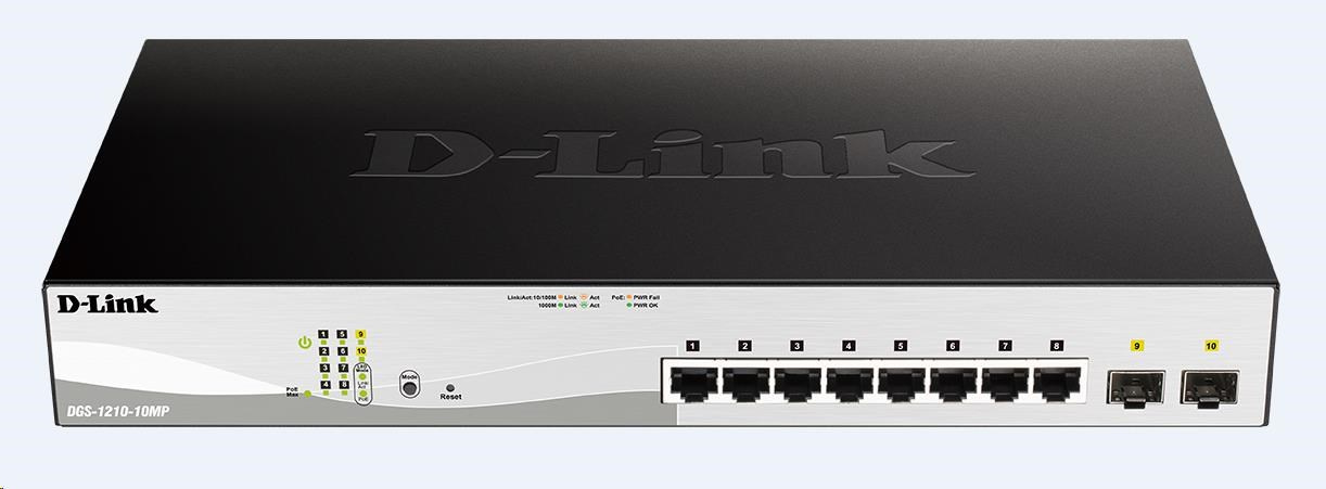D-Link DGS-1210-10MP 10-port Gigabit Smart+ PoE Switch, 8x GbE PoE+, 2x SFP, PoE 130W, fanless