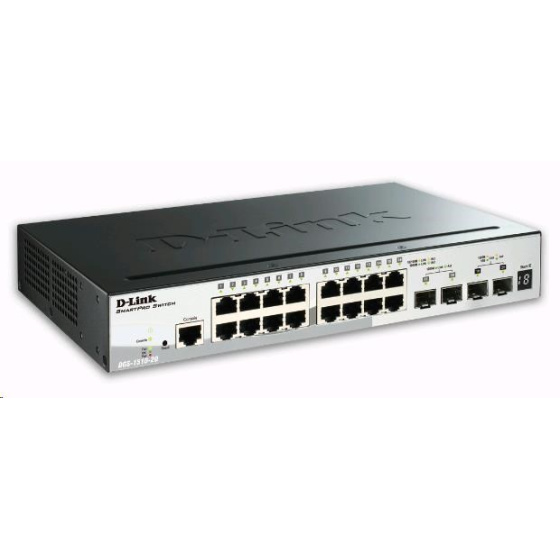 20-Port Gigabit Stackable SmartPro Switch including 2 SFP ports and 2 x 10G SFP+ ports - 16 x 10/100/1000Mbps Auto-Negotiating Ports - 2 x Mini-GBIC SFP ports - 2 x SFP+ ports - Physical Stacking up to 6 units per stack. Stacking Bandwidth of 40Gb. Topology Linear or Ring. - D-Link Green 3.0, 802.3az - Virtual stacking - Static route - IPv6 Management/Ready Logo - Half-/Full-Duplex, auto-negotiation, Auto MDI/MDIX - IEEE 802.3x Flow Control - 802.3ad Link Aggregation - Asymmetric VLAN, Auto Voice VLAN, GVRP - 802.1p priority queues - MAC/IP filtering - MAC/IP-based ACL - 802.1X port-base Access Control, Port Security, traffic segmentation - D-Link Safequare Engine - Smart Console Utility, web based management, compact CLI - D-View 6.0 support - 19" Rackmount Installation.