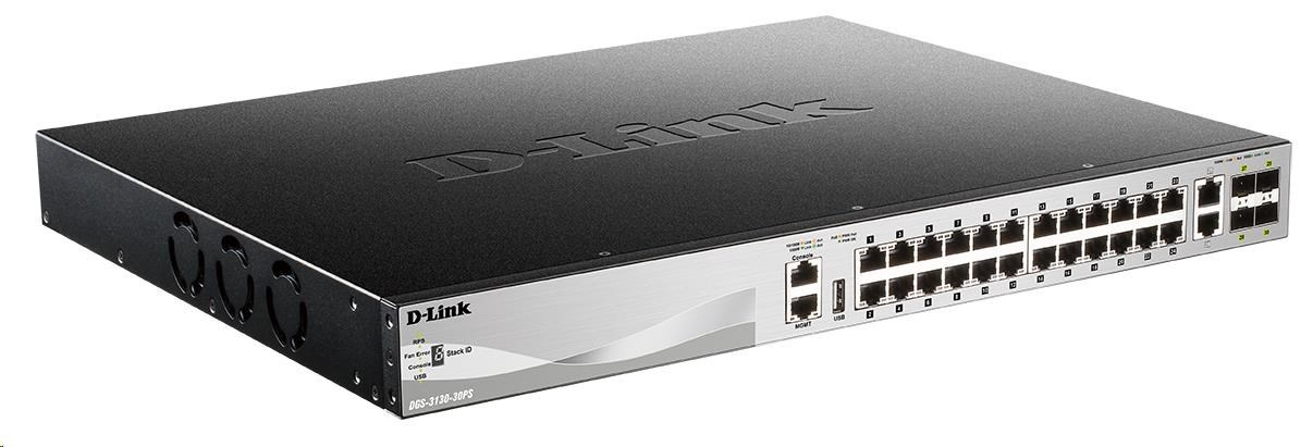 Popis D-Link DGS-3130-30PS/E L3 Stackable Managed Gigabit PoE Switch, 24x PoE gigabit, 2x 10GBASE-T, 4x SFP+, 370W PoE