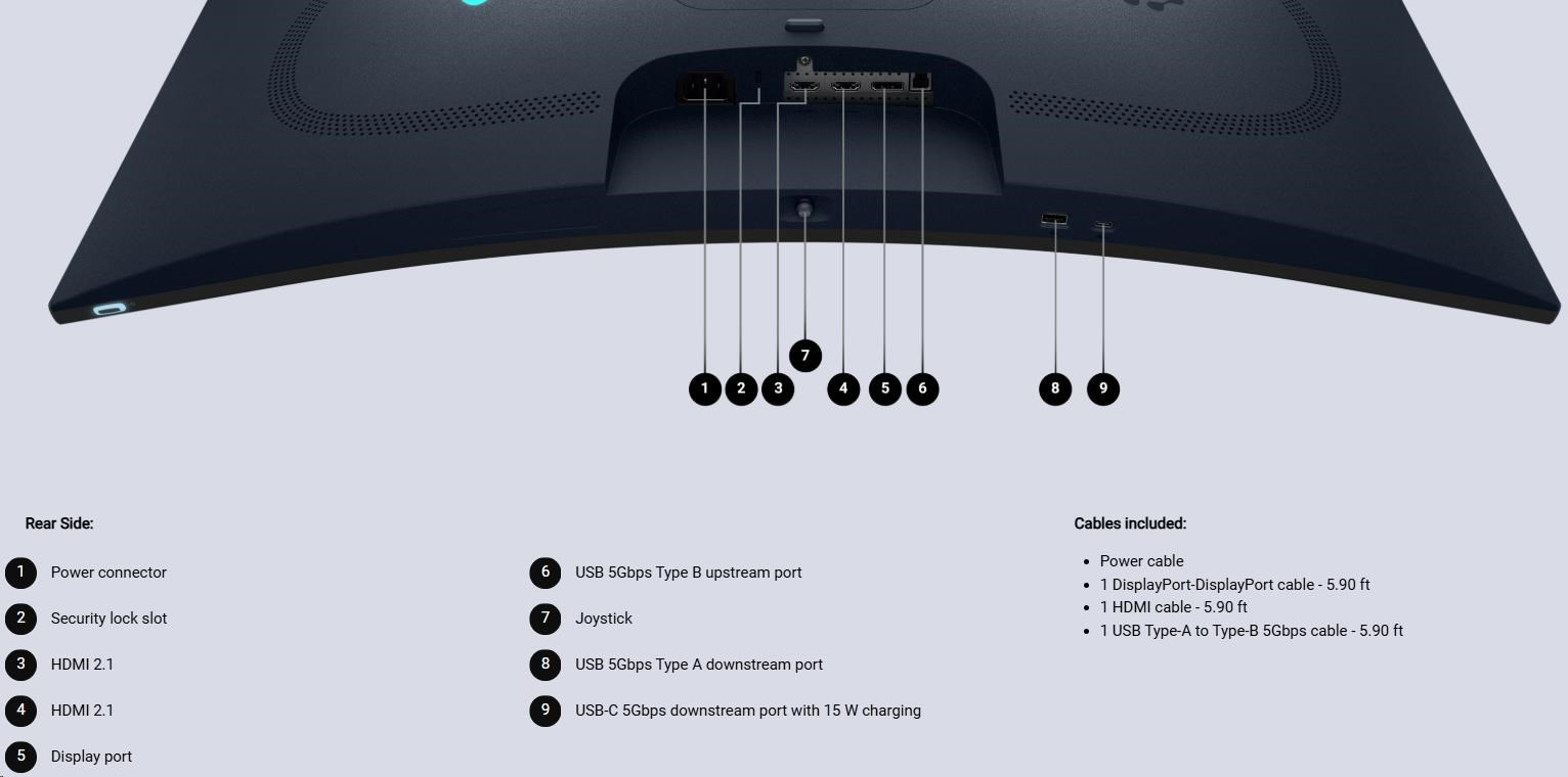 - 2 HDMI ports (HDCP 1.4 & 2.3) (Supports up to 3440 x 1440, 240 Hz, FRL, HDR, VRR as per specified in HDMI 2.1)