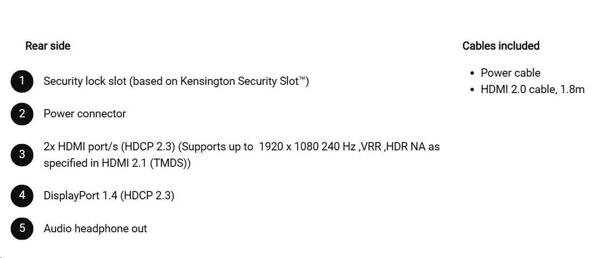 Rozlišení displeje:1920x1080 (Full HD); Úhlopříčka displeje ("):24; Výbava:VESA montáž; Rozhraní vstup:HDMI; HDMI počet:1; HDMI verze:2.1; Doba odezvy (ms):5; Formát obrazovky:16:9; Typ panelu:IPS; Jas (cd/m2):300; Kontrast:1:1000; Povrchová úprava displeje:Matný; VESA rozměry:100x100; Standardní záruka (roky):3; Rozhraní:DisplayPort.Více