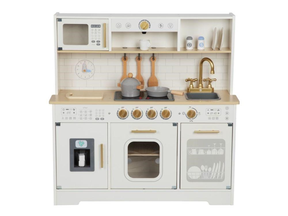 Dětská kuchyňka v krémové barvě, se zlatými detaily, je svým skandinávským stylem vhodná do každého interiéru. Dřevěná kuchyňka se spoustou moderních spotřebičů nadchne každého malého kuchtíka a hospodyňku. V dětské kuchyňce si děti vyzkouší vaření, pečení, umývání nádobí a chystání pokrmů bezpečným dětským způsobem. Při hře v dětské kuchyňce děti zdokonalí své dovednosti a ještě si užijí spoustu zábavy..