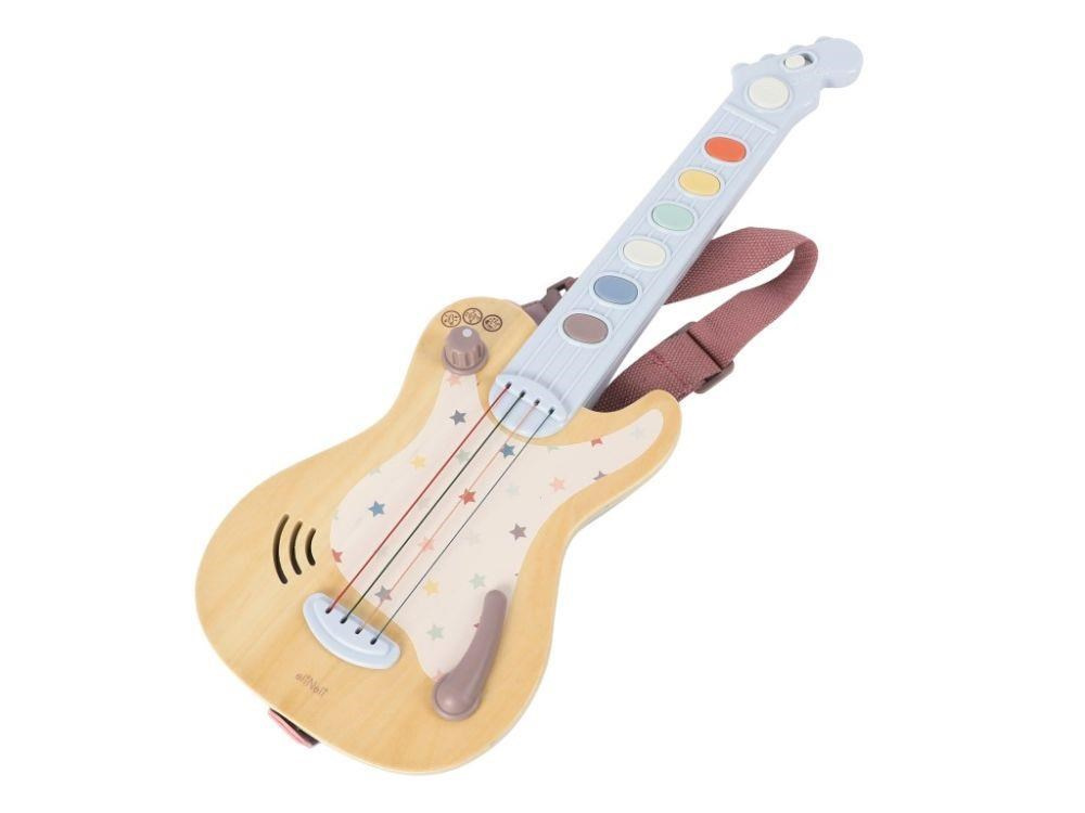 Dětská elektrická kytara, v kombinaci jemných pastelových barev s barvou přírodního dřeva, promění každé dítě v rokovou hvězdu. Hudební hračka v podobě elektrické kytary probudí lásku k hudbě u každého dítěte, zdokonaluje motorické dovednosti, rozvíjí sluchové vnímání, fantazii a kreativitu, umožňuje dětem hrát role. Pro snadné přenášení je součástí kytary praktický popruh..