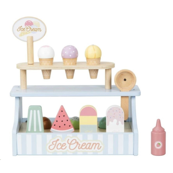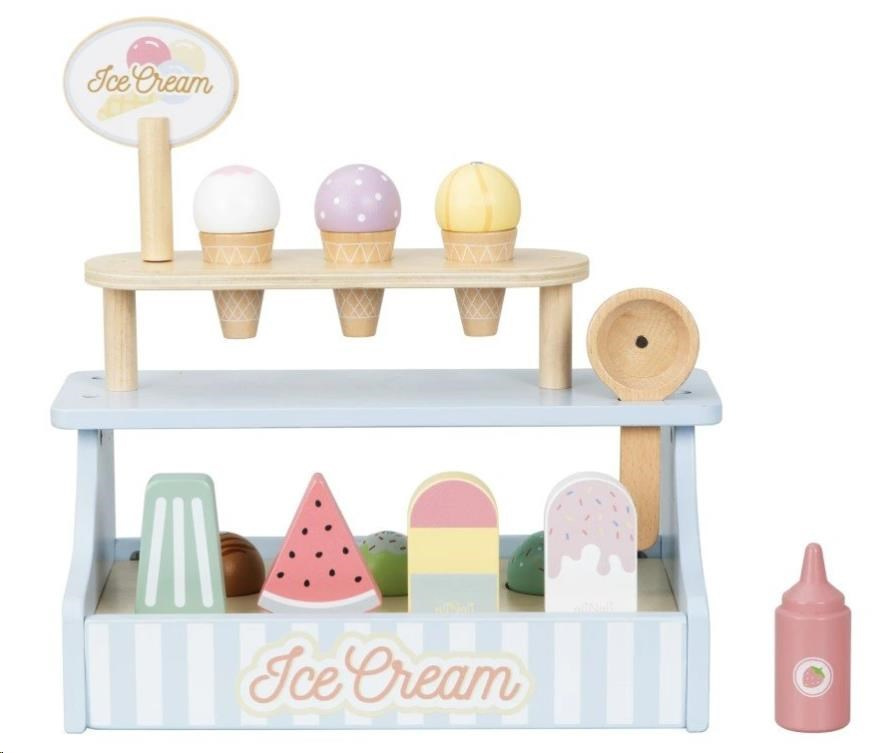 Dřevěný obchůdek (prodejní stánek) s lahodně vypadající zmrzlinou a nanuky je parádní dřevěnou hračkou pro holčičky i kluky. V dětském obchůdku s bohatým příslušenstvím v podobě zmrzlinových kornoutů, vyměnitelných kopečků zmrzliny, nanuků, naběračky na zmrzlinu i jahodové polevy, mohou děti prodávat v zimě i v létě, aniž by se mražené dobroty rozpustily..