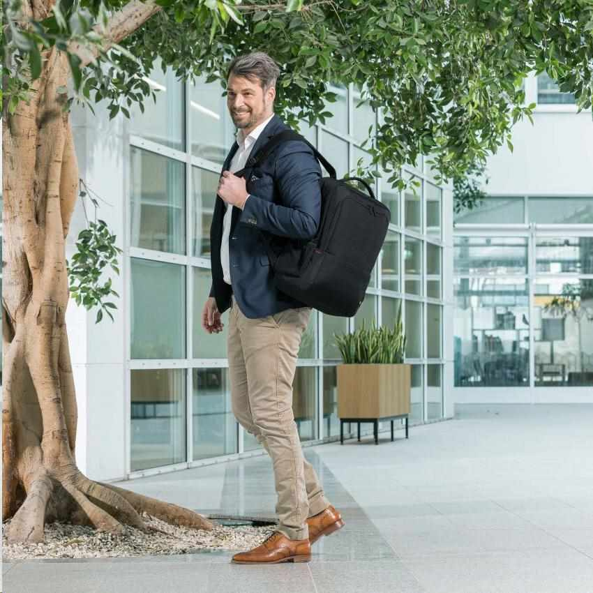 The compact Plus BASE backpack offers ideal protection for laptops between 13 and 15.6" thanks to its high-density foam (HDF) padding. The case fully protects your device and the elastic strap also secures it within its compartment. The spacious main section is divided so that documents and accessories can be stored separately. The front pocket has practical smaller compartments so you can organise smaller items like your smartphone, pens or chargers. You can safely store your passport, wallet or other valuables in the hidden zipped compartment on the back of the case. There is space for your water bottle or umbrella in the easily accessible mesh side pockets. You can therefore ensure that everything you need is always to hand. The backpack's ergonomic padding makes it comfortable to wear on your back and the shoulder straps can also be adjusted for further comfort. The Eco Backpack Plus BASE is therefore perfect for you if you are always on the go and want to support the recycling of PET bottles with an eco-friendly bag.