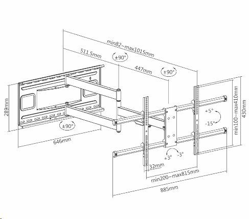 Otáčení Tv 43-80" i kolmo ke zdi na obě strany, délka 82-1015mm, naklápění, VESA 200x100 až 800x400, nosnost 50kg Extra dlouhý držák pro otáčení kolmo ke zdi i velkých televizorů s úhlopříčkou až 80". Díky nastavitelné vzdálenosti od zdi od 82mm až do 1015mm umožňuje držák Ergosolid Largo otočení o 90° na obě strany televizí s úhlopříčkami 43" až 80". Díky nosnosti 50kg a velmi pevné konstrukci je polohování velmi bezpečné a spolehlivé. Televizi je možné naklápět +5° až -15° a korigovat rovinu obrazovky o +/-3°. Díky nástěnnému úchytu s rozměry 646mm a 289mm se celková hmotnost držáku s televizorem velmi dobře rozloží na velkou plochu, instalace je velmi bezpečná. Na držáku je bezpečnostní šrouby pro zajištění Tv na držáku a zamezení nechtěnnému vysazení nebo pádu Tv. Barevné provedení černé, materiál ocel. Záruka 5 let. Technické údaje: nosnost 50kg podporuje VESA standardy 200x100 až 800x400 zavěšení a otáčení kolmo ke zdi Tv 43" až 80" nastavitelná vzdálenost od zdi 82mm až 1015mm možnost naklápění televize +5° až -15° korekce roviny obrazovky +/- 3° instalační materiál součástí balení (viz. níže) velmi pevná a bezpečná konstrukce zajištění Tv na držáku proti vysazení materiál ocel hmotnost držáku 13,5kg velká instalační plocha pro rozložení hmotnosti na zdi 646 x 289mm barevné provedení černé záruka 5 let.