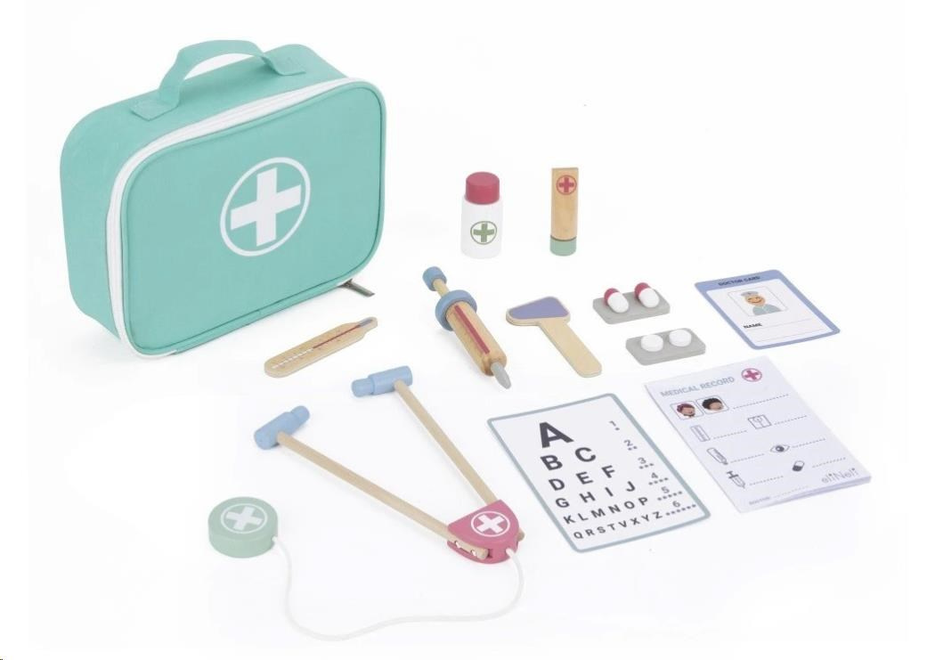 Doktorský set obsahuje: 1 látkovou brašnu, 1 stetoskop, 1 otoskop, 1 teploměr, 1 injekční stříkačku, 1 balení léků, 1 léčivou mast, 4 dřevěné tabletky, oční tabuli v rozměru 15 x 10 cm, jmenovku, vyšetřovací kartu.