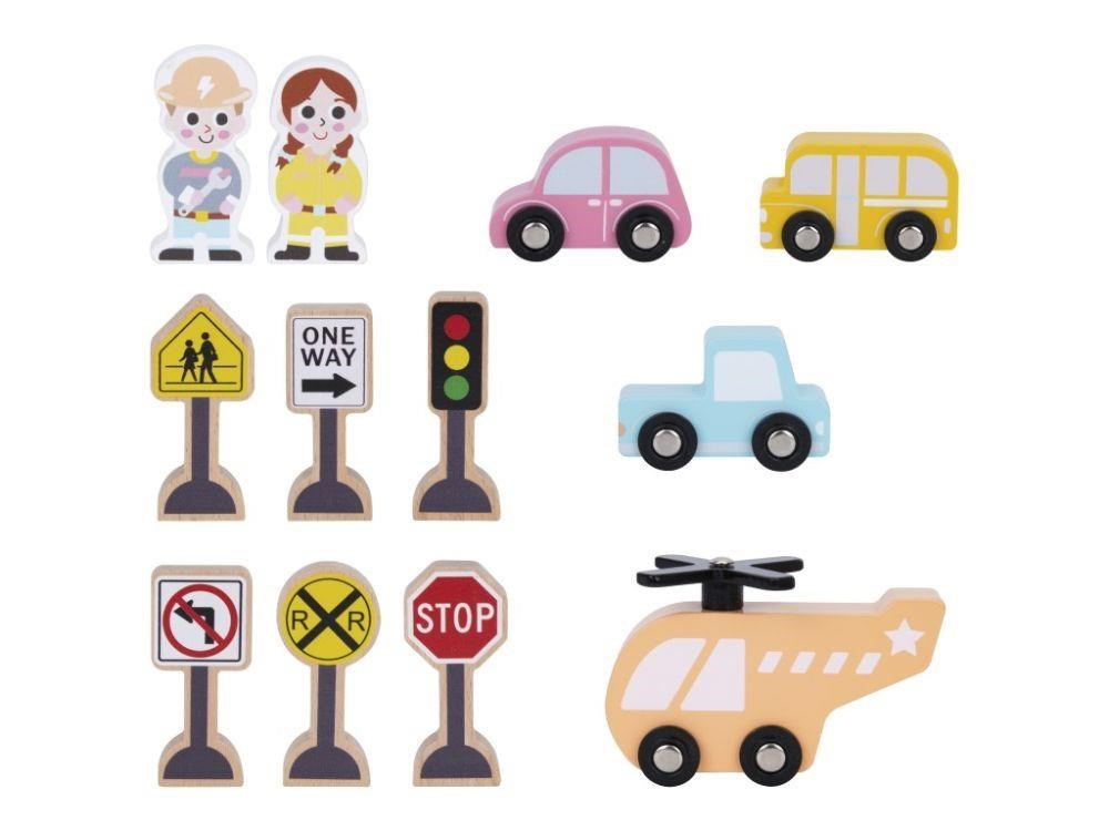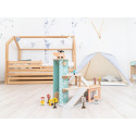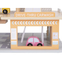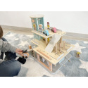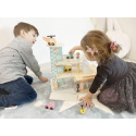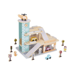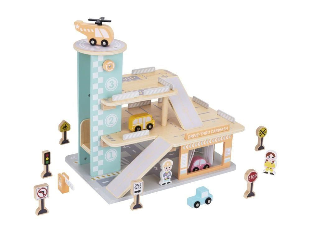 Garáž na autíčka s myčkou, v krásných jemných barvách, přinese dětem spoustu zábavy. Součástí 3 patrové dřevěné garáže je parádní myčka aut, tankovací stojan, výtah, heliport i spousta parkovacích míst pro autíčka. Bohaté příslušenství v podobě helikoptéry, autíček, dopravních značek a obsluhy garáže umožní, aby si s garáží pro autíčka vyhrálo vaše dítko samo nebo se svými kamarády..