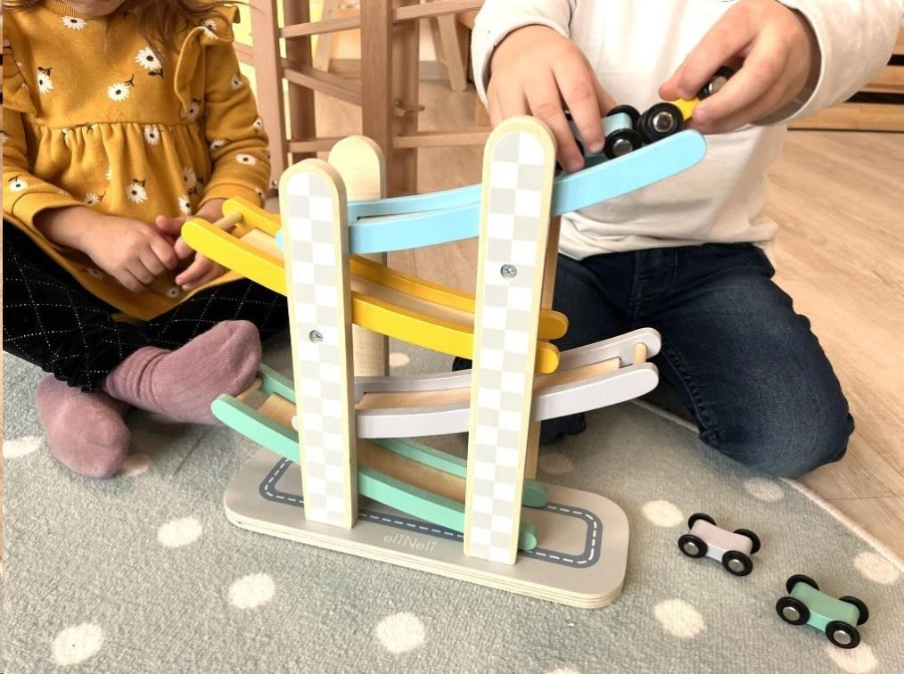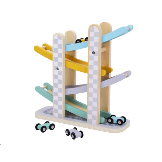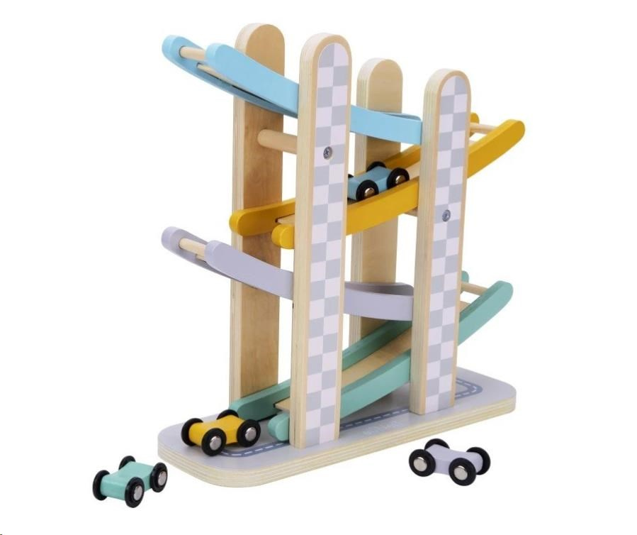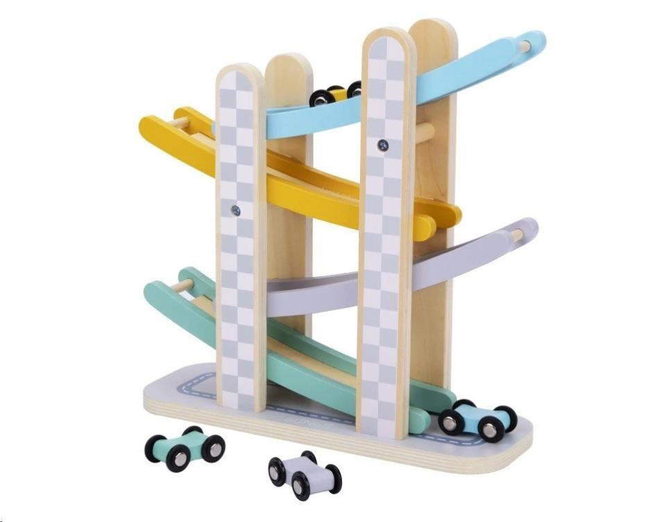 Dřevěná závodní dráha, autodráha se 4 autíčky, probudí duši závodníka v každém dítku. Uspořádání závodů se závodními auty přímo v dětském pokoji je zábavnou hrou pro celou rodinu. Z autíček v krásných pastelových barvách si vybere každý svého favorita. Rozhodující při této hře je správná koordinace, přesnost, chvíle soustředění, zkrátka správně umístit závodničku na nejvyšší patro závodní dráhy.