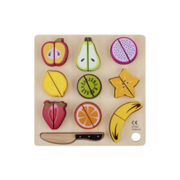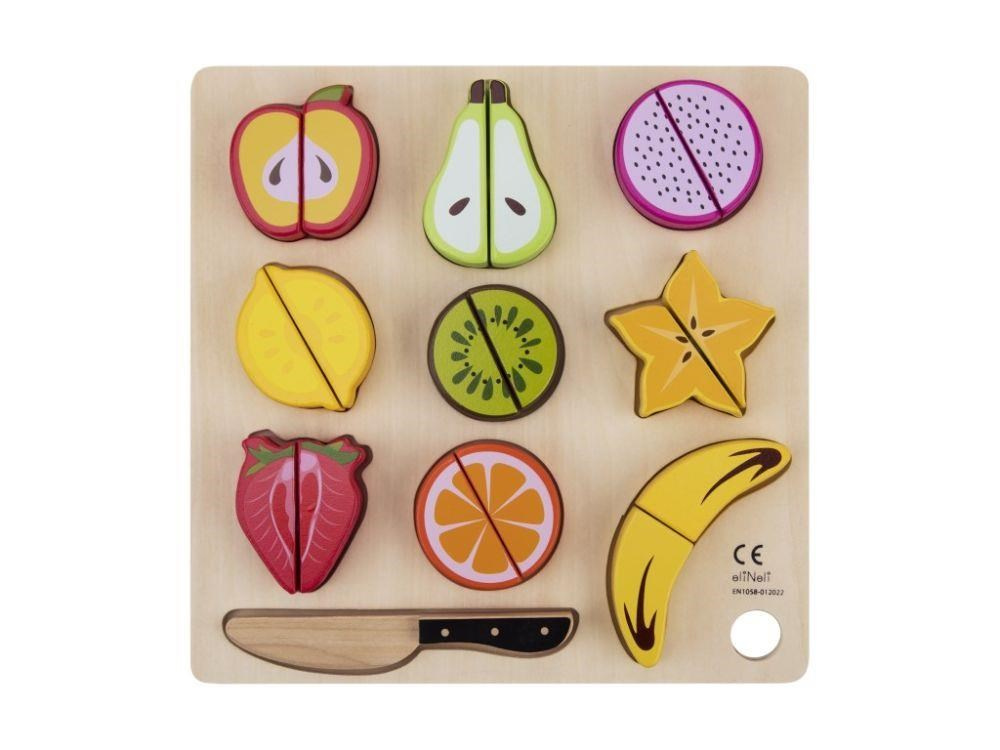 Dřevěné ovoce ke krájení je hračkou, která by neměla chybět v žádné dětské kuchyňce ani dětském obchůdku. Toto krájení je pro děti zcela bezpečné. Půlky ovoce jsou spolu spojený suchým zipem, díky kterému děti ovoce dřevěným nožem jednoduše rozkrojí. Balení obsahuje 9 druhů ovoce, dřevěné prkénko i dřevěný nůž..