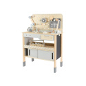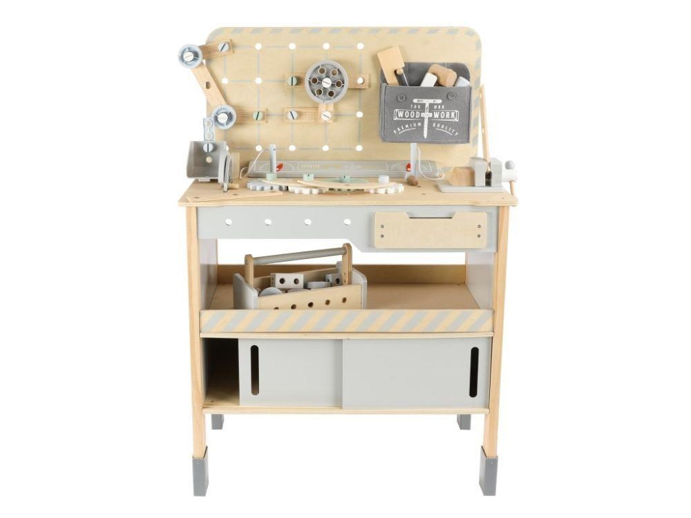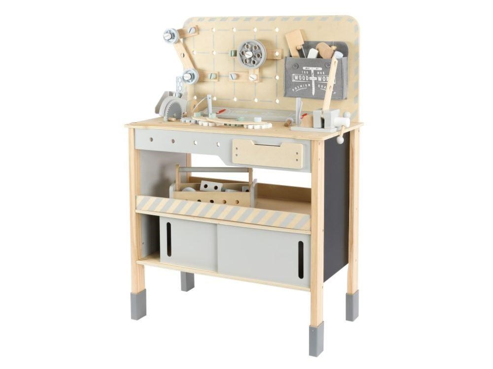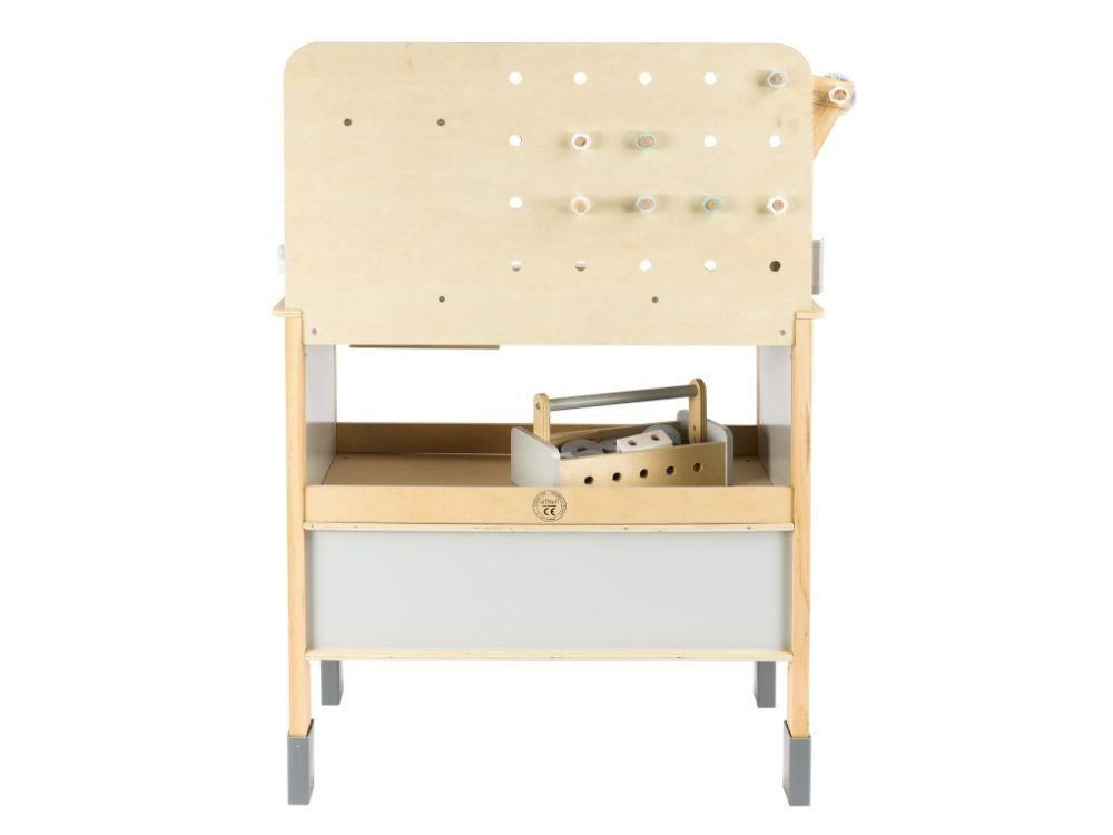 Dětský dřevěný ponk XXL se spoustou příslušenství, parádním jeřábem a opaskem na nářadí ZDARMA nadchne každého malého kutila. Dětský ponk v kombinaci šedé barvy s barvou přírodního dřeva, s jeřábem, nářadím, šrouby, destičkami a hlavně se spoustou vychytávek potrénuje jemnou motoriku, manuální zručnost, koordinaci očí a rukou, rozvíjí kreativitu, učí děti soustředit se a trpělivosti..