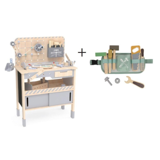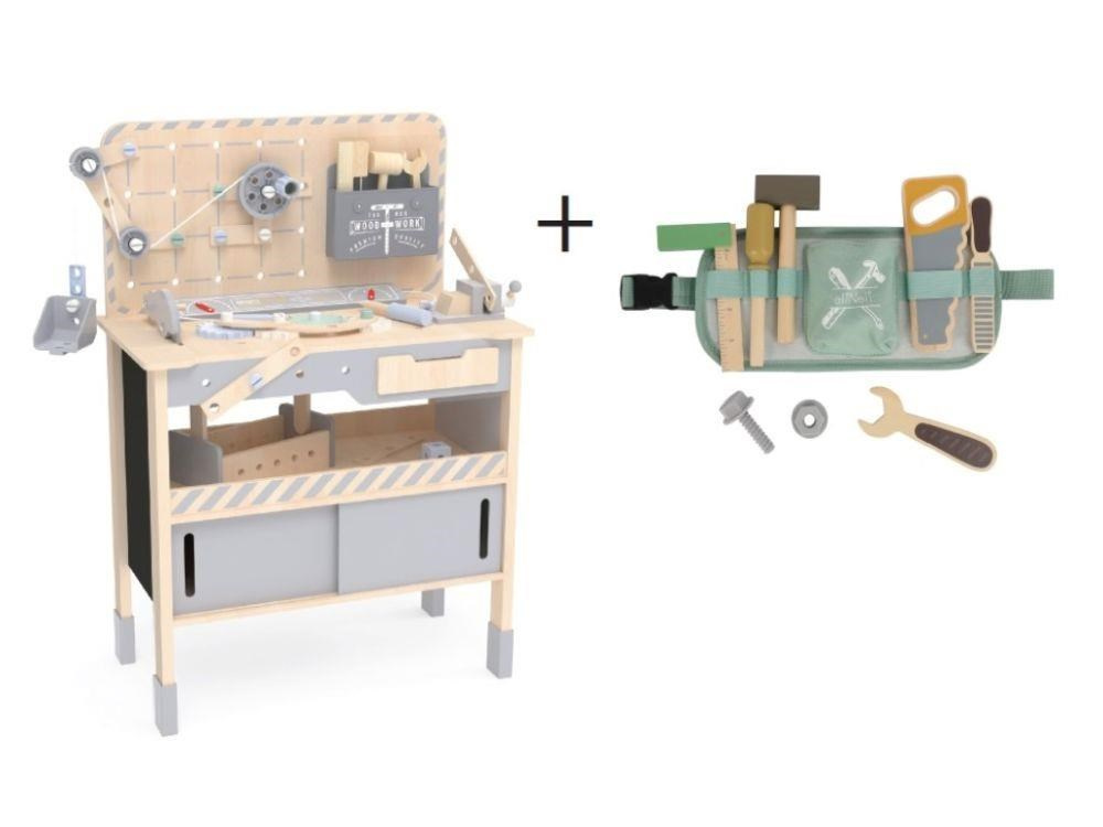 Dřevěný dětský ponk XXL s nářadím a rozšířeným příslušenstvím + opasek na nářadí ZDARMA