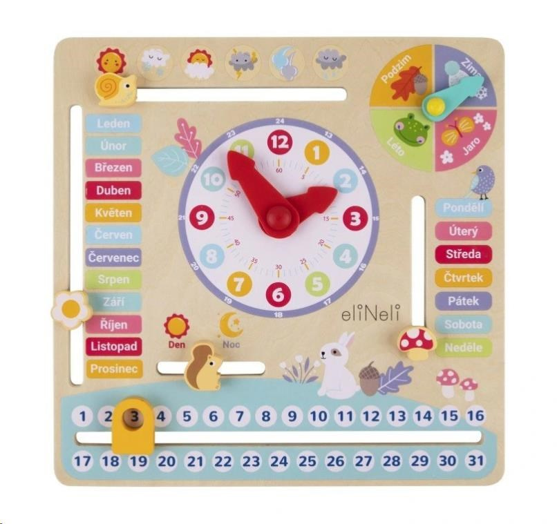 Dřevěný kalendář pro děti v českém jazyce je krásnou hračkou i dekorací do dětského pokoje. Kalendář s lesními zvířátky provede děti celým rokem. Děti se za pomocí roztomilých zvířátek naučí rozeznávat roční období, dny v týdnu i v měsíci, měsíce v roce a dokonce poznávat čas. Uprostřed kalendáře jsou totiž umístěné velké hodiny s červenými ručičkami.
