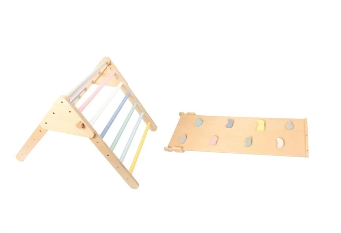 Montessori Piklerové trojúhelník v setu s oboustranným prknem 2v1 (lezeckou stěnou a skluzavkou v jednom) je šplhací pomůckou - dětskou prolézačkou do interiéru, která nabízí nespočet možností ke hře i sportovním aktivitám. Díky malému domácímu hřišti, vyrobeného z kvalitního přírodního dřeva, si děti užijí spoustu zábavy a zdravého pohybu i za nepříznivého počasí, klidně přímo v jejich dětském pokoji.