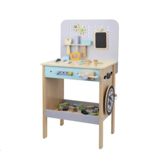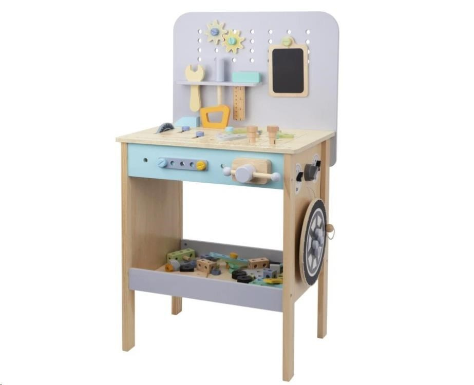 Dětský dřevěný ponk v jemných pastelových barvách nadchne děti i dospělé svým nadstandardním vybavením. Mimo klasického kutilského nářadí je jeho součástí i kotoučová pila, svěrák a dokonce kompresor. Bohaté příslušenství a různé vychytávky jsou zárukou zábavné hry na kutila, která u děti zdokonalí jejich dovednosti a naučí je novým.