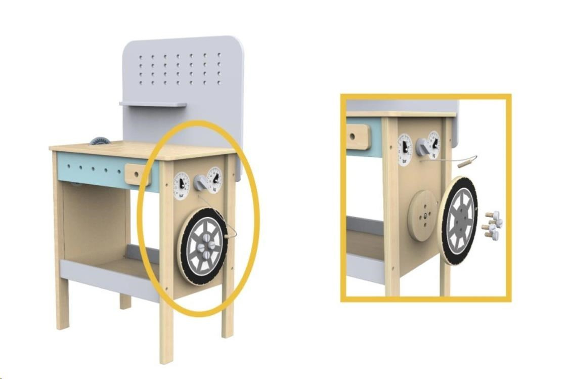 Originální dřevěný ponk se spoustou příslušenství a s kompresorem nadchne každého malého kutila. Dětský ponk v jemných pastelových barvách s nářadím, šrouby, matkami a hlavně se spoustou vychytávek potrénuje jemnou motoriku, manuální zručnost, koordinaci očí a rukou, rozvíjí kreativitu, učí děti soustředit se a trpělivosti.