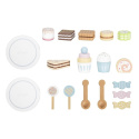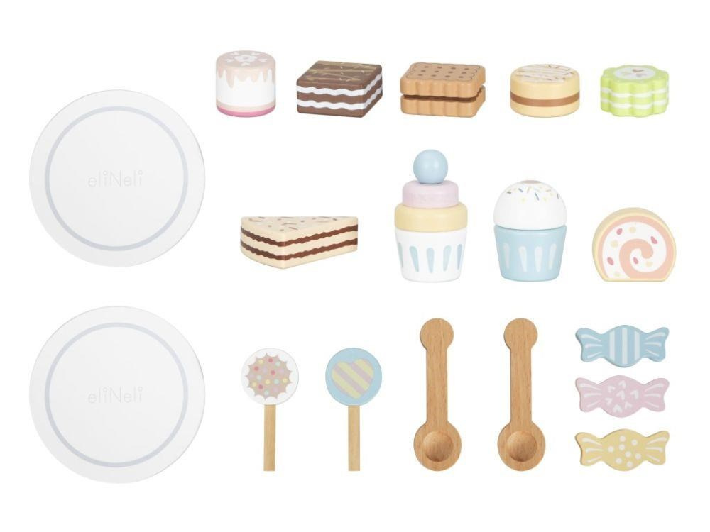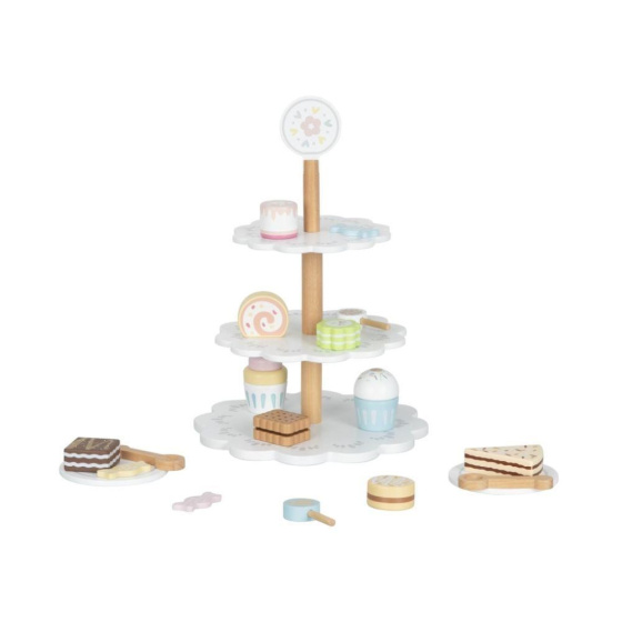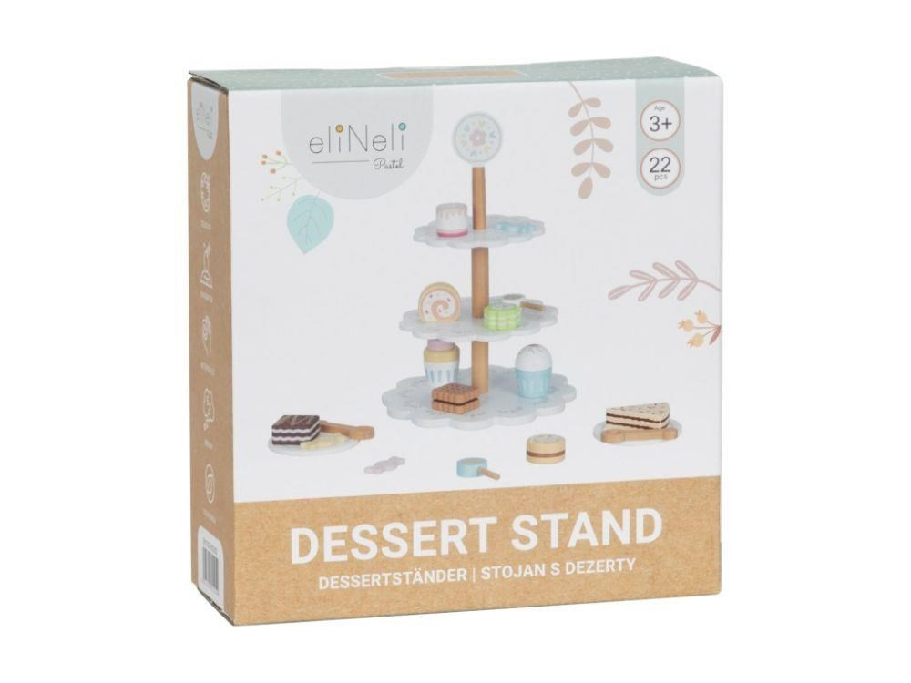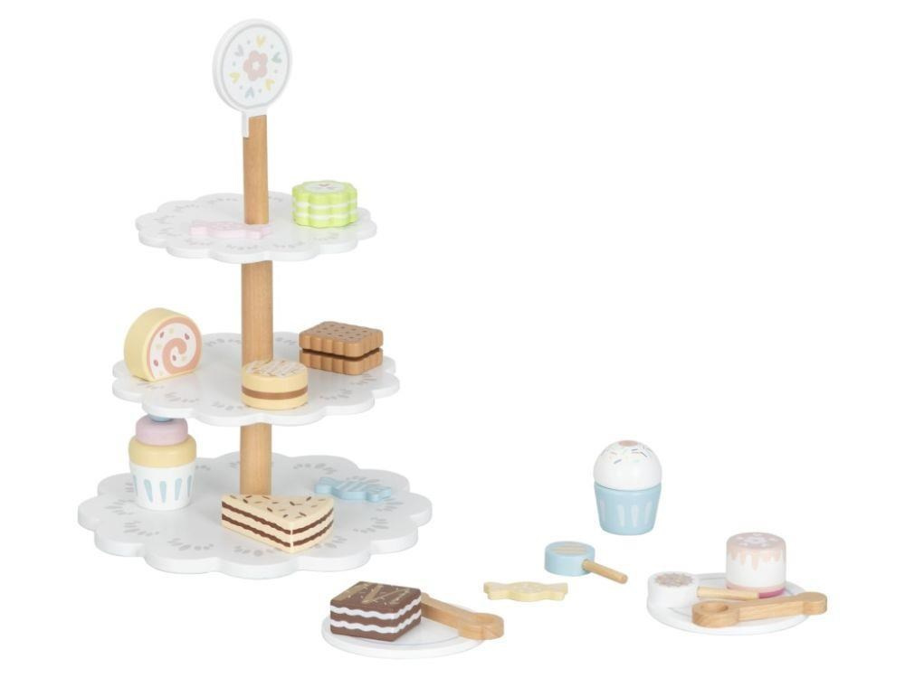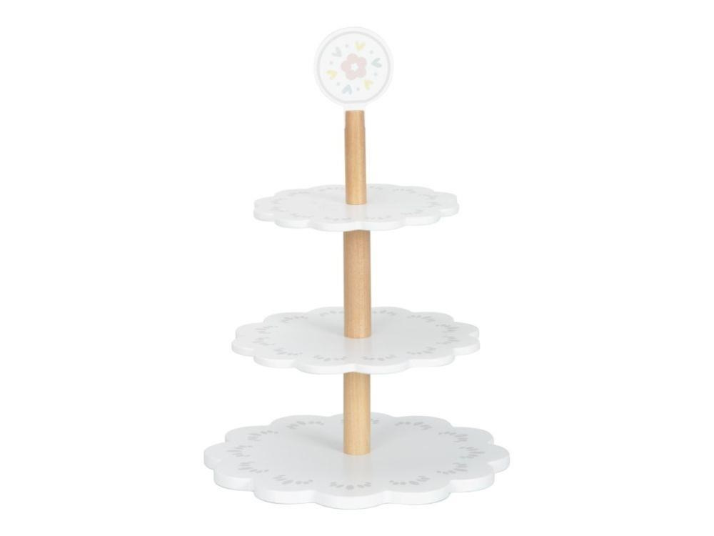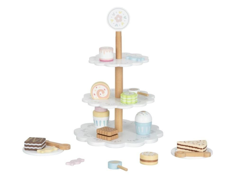 Dřevěný patrový stojan s lahodně vypadajícími dřevěnými zákusky a cukrovinkami je jako stvořený pro oslavy a čajové dýchánky uspořádané pro rodiče, kamarády i oblíbené plyšáky. Dřevěný stojan s bohatým příslušenstvím je skvělým doplňkem do dětské kuchyňky i obchůdku. Děti si mohou zahrát na cukráře i prodavače, rozvíjet svou fantazii a zdokonalovat dovednosti..