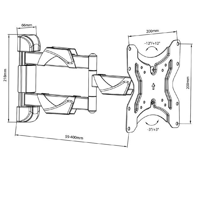 Nástěnný držák na LCD LED Tv 17-50", otočný až +/-90°, sklopný +/-12°, vzdálenost od zdi 59-400mm, VESA 75x75 až 200x200, krytky na kabeláž, nosnost 25kg.Více