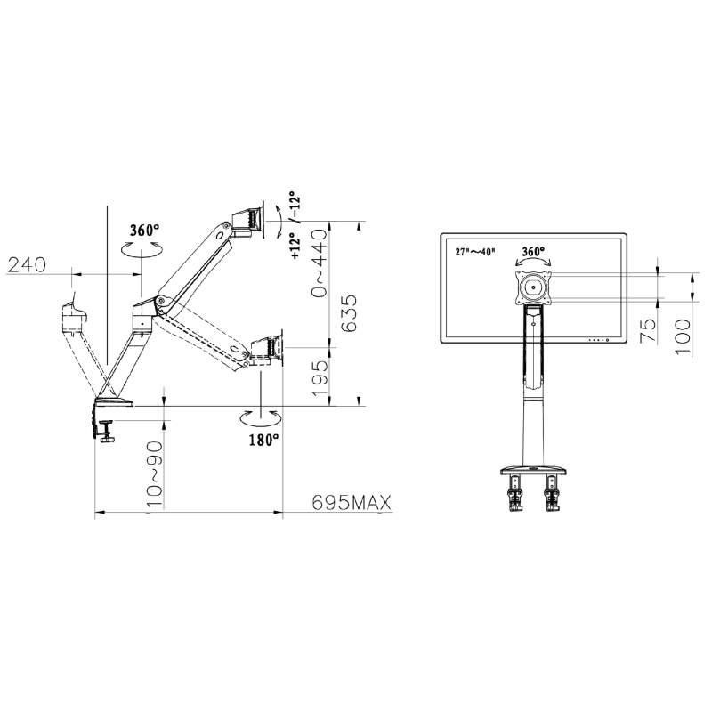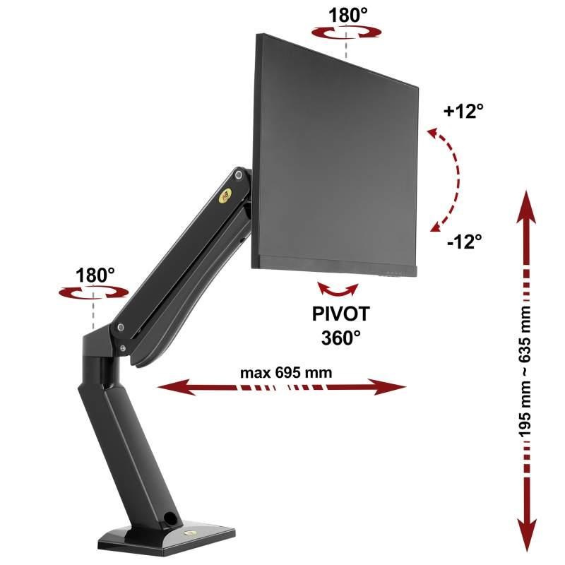 Stolní držák na monitor nebo Tv 27-43", otočný +/-180°, sklopný +/-12°, nastavení výšky 195-635mm, délka dle otočení 0-695mm, pivot, vedení kabeláže, 2 typy stolních úchytů, VESA 75x75 a 100x100, nosnost 15kg.Více
