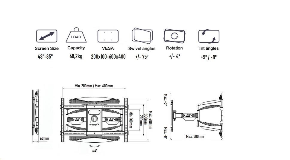 Profesionální držák Tv 43" - 85", otáčení do stran až +/- 75°, naklápění +5° / -8°, vzdálenost od zdi 60 - 500mm, VESA standardy 200x100 až 600x400, korekce roviny +/- 4°, systém vedení kabeláže, nosnost 68,2 kg.Více