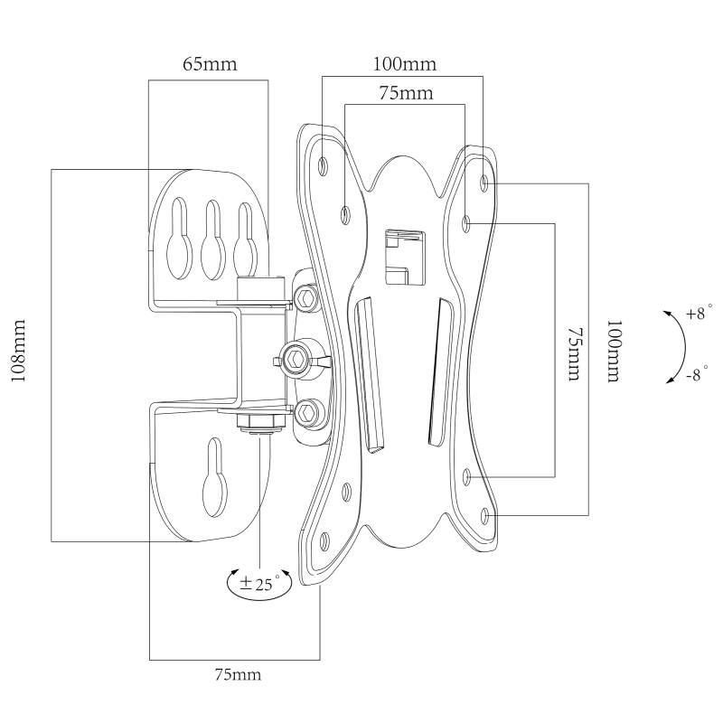 Držák na Tv a monitory 10-30", mírné otáčení do stran +/-25°, naklápění +/-8°, odsazení od zdi 75mm, VESA 75x75 a 100x100, nosnost 25kg.Více