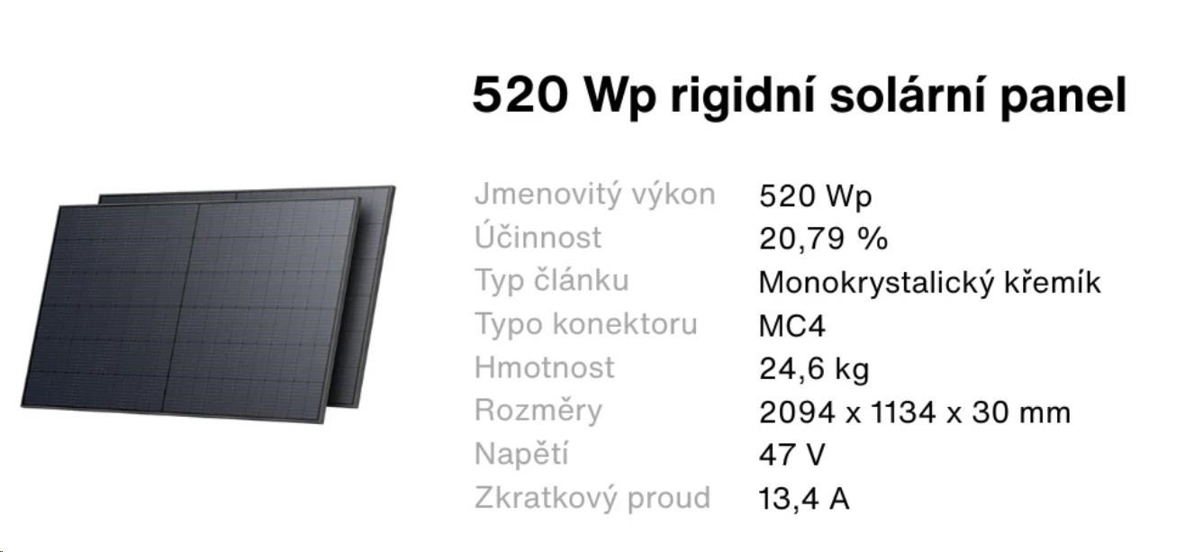 Popis EcoFlow sada dvou 520W rigidních solárních panelů