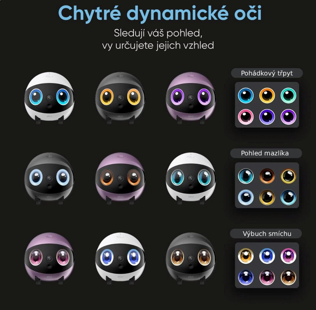 • Chytré dynamické oči – dva displeje s nastavitelnými barvami a animacemi dodávají robotovi osobnost a přátelský vzhled