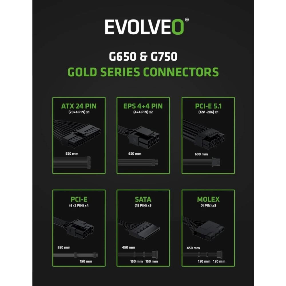 Popis EVOLVEO G850 zdroj 850W, 80+ GOLD, ATX 3.1, aPFC, 140 mm ventilátor