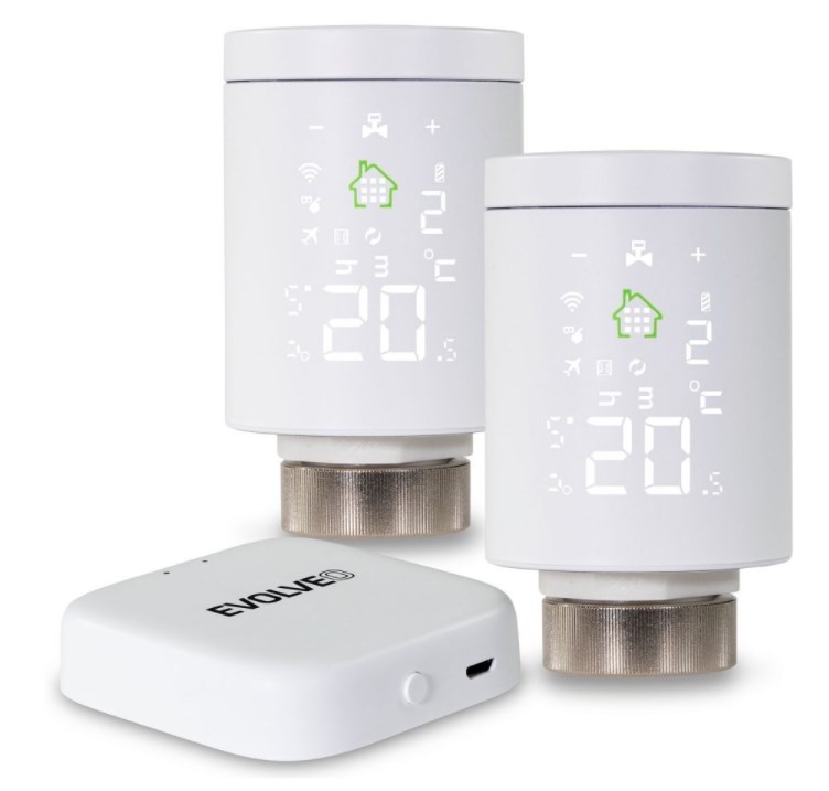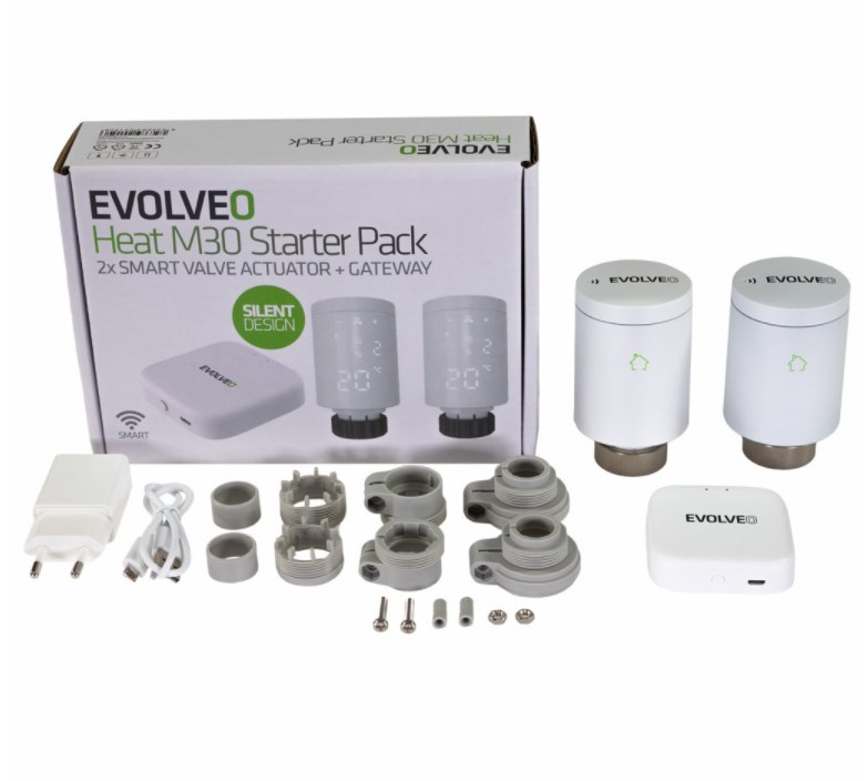 Chytrá bezdrátová termostatická hlavice na radiátor, set obsahuje dva kusy + centrální Wi-Fi jednotku, ovládání přes aplikaci Android/iOS v češtině, white paper LED display s dotykovým ovládáním, kompatibilní s Google Assistant a Amazon Alexa, denní a týdenní plánování, připojení na závit M30 a kompatibilní s ventily RA, RAV, RAVL