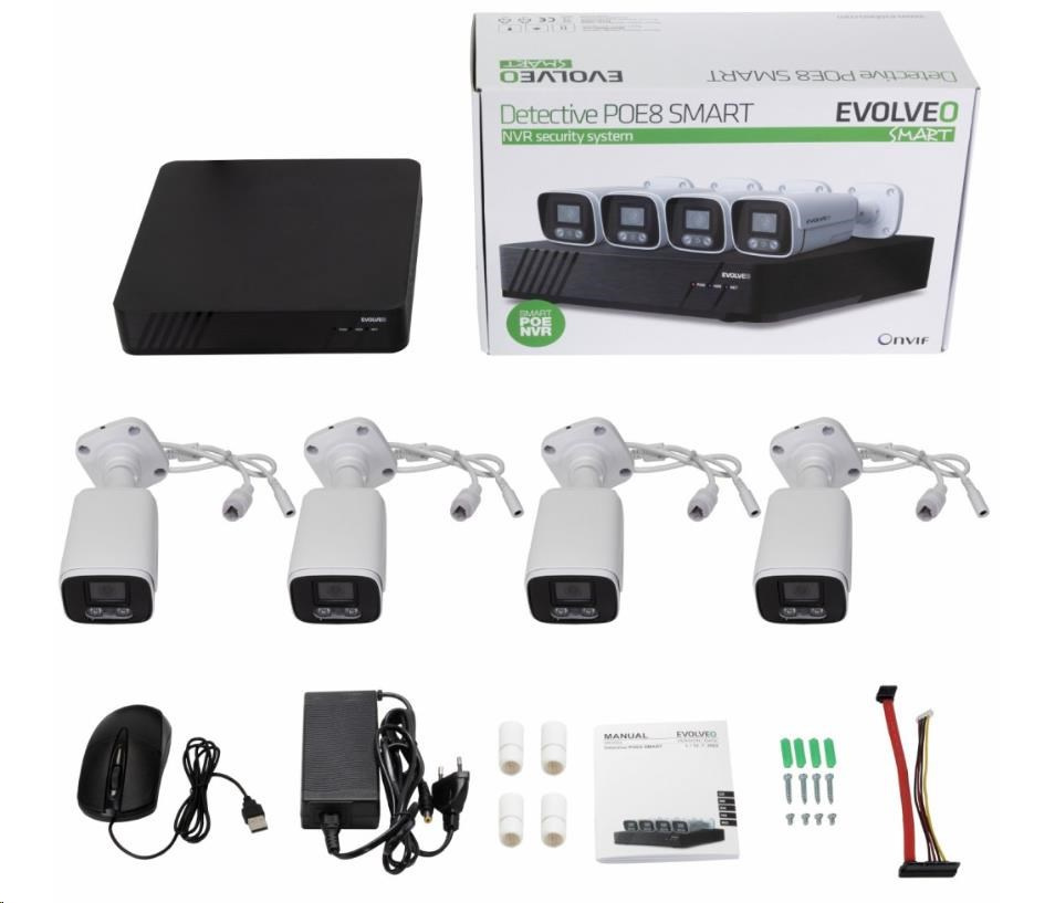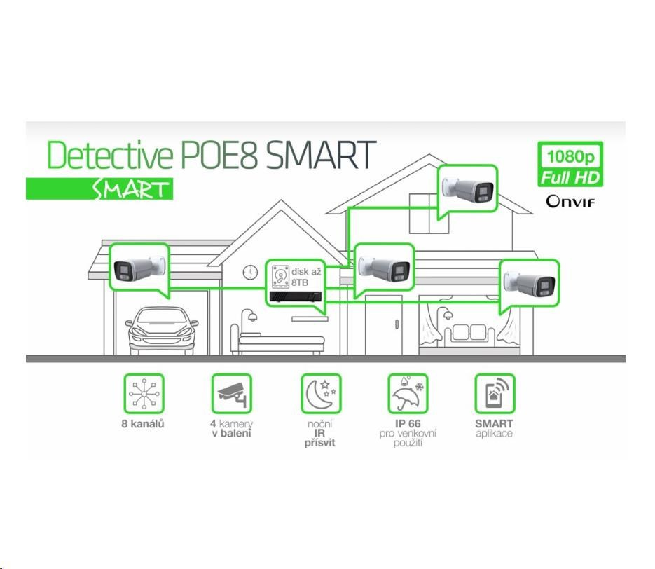 8 kanálový kamerový systém EVOLVEO Detective POE8 SMART je ideální řešení pro monitorování a bezpečnost vašeho domu, kanceláří, skladu nebo firmy. Jedná se o kompaktní kamerový systém, který využívá POE napájení kamer, není tedy nutné mít u každé kamery ještě zásuvku pro napájecí adaptér. UTP Kabel opatřený RJ45 konektorem na obou koncích, se postará jak o napájení kamery, tak i přenos signálů z NVR jednotky až ke kamerám. Jeho čistý obraz jak ve dne tak v noci využijete pro ochranu a monitorování nejen vaše rodinného domku nebo firmy, ale i pro dozor nad prodejnou nebo pro dohled nad veřejným prostranstvím. Veškeré nahrané události se nahrávají přímo na pevný disk, který vložíte do hlavní jednotky, a tak máte vaše data plně pod kontrolou. K záznamu máte přístup pomocí mobilní aplikace, nebo iCMS programu pro OS WIndows. Záznam lze také prohlížet na monitoru připojeném přímo do NVR jednotky pomocí HDMI nebo VGA kabelu.