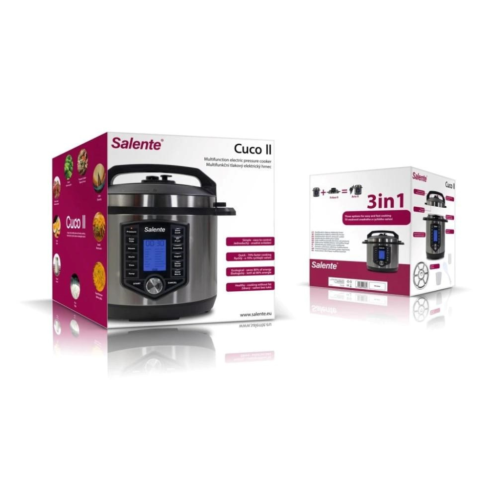 Salente Cuco II spojuje tři způsoby přípravy pokrmů v jednom moderním zařízení. Hrnec můžete použít jako tlakový, pomalý nebo pro restování. Režimy se liší podle použitých pokliček. V jednom hrnci si snadno a rychle připravíte vynikající guláš, zeleninu v páře nebo domácí poctivý vývar.