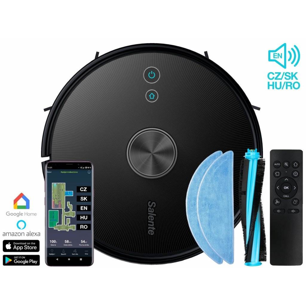 Aplikace Salente umožňuje ovládat vysavač mobilním telefonem nebo tabletem na dálku. Informuje vás o aktuálním stavu vysavače, můžete spustit různé režimy úklidu nebo nastavit úrovně vysávání nebo vytírání. Aplikace je v českém jazyce a je určena pro operační systémy Android a iOS. Pokud nejste fanouškem mobilních aplikací, můžete vysavač ovládat i pomocí přiloženého dálkového ovladače nebo tlačítky na vysavači.