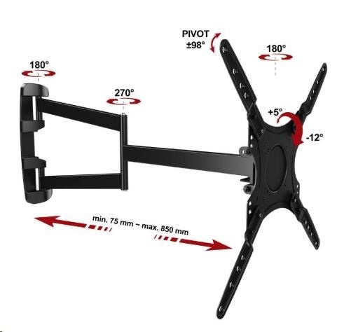 Nástěnný držák Tv s nastavitelnou délkou 7,5 až 85cm, otočný do stran, sklopný, nosnost 30kg, VESA 75x75 až 400x400.Více