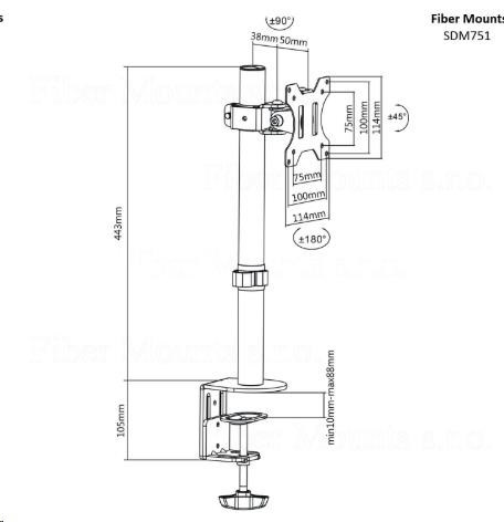 Fiber Mounts SDM751 - levný stolní držák na monitor Kvalitní nastavitelný stolní držák na monitor 13-32", otočný, sklopný, výškově stavitelný Univerzální stolový držák pro uchycení monitoru s úhlopříčkou 13-32". Spolehlivé a bezpečné upnutí, 2 možnosti ukotvení na jakoukoliv vodorovnou plochu o síle 10-88mm. Polohování obrazovky otáčením do stran, náklonem a výškovou regulací. Velmi pevná a bezpečná konstrukce z oceli. Nosnost 8kg, podpora VESA standardu 75x75 a 100x100. Díky své kvalitě a velmi příznivé ceně se tento držák stal velmi oblíbeným a vyhledávaným pro instalaci v domácnostech a ve školních učebnách, velmi často se s ním setkáte i ve firmách, kancelářích a prodejnách. Levný držák na monitor, televizor, tablet nebo EET pokladnu s úhlopříčkou 13-32 palců, VESA standard, otočný, sklopný, výškové nastavení, 2 typy ukotvení - Fiber Mounts SDM751 / drzakyastolky.cz Technické údaje: maximální zatížení 8kg podporuje VESA standardy 75x75 a 100x100 možnost rozšíření na VESA 200x100 nebo 200x200 doporučená úhlopříčka obrazovky 13 až 32" vhodný na monitory, televizory, tablety i EET pokladny otáčení do stran +/- 90° náklon +/- 45° celková výška 443mm výškové polohování obrazovky upnutí na vodorovnou plochu o síle 10-88mm součástí balení 2 typy upnutí bezpečné a spolehlivé zavěšení obrazovky fixace kabeláže materiál ocel barva černá záruka 2 roky Držák podporuje VESA standardy: VESA 75x75 VESA 100x100.Více
