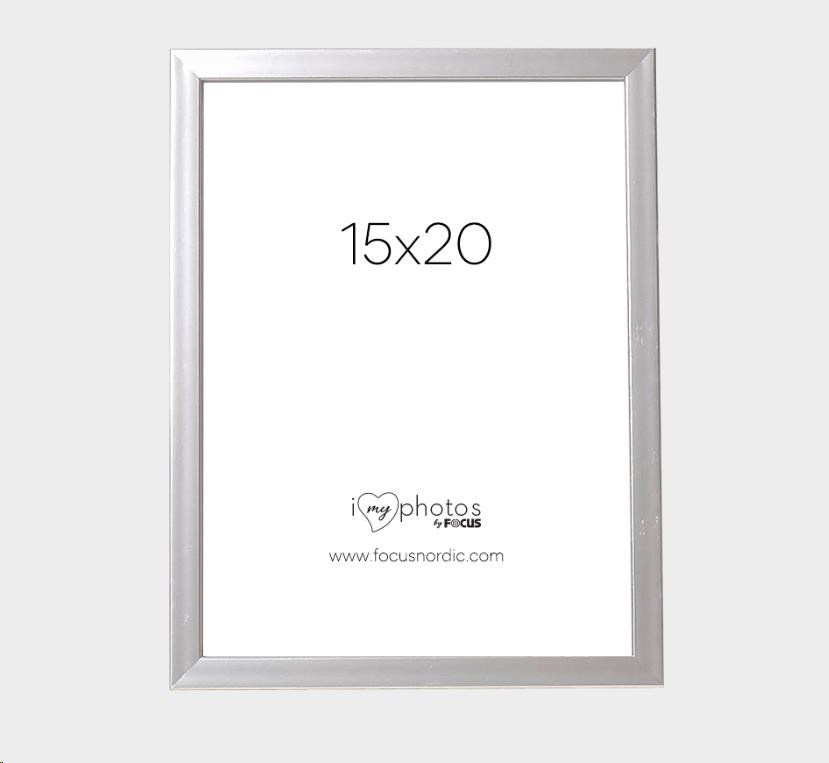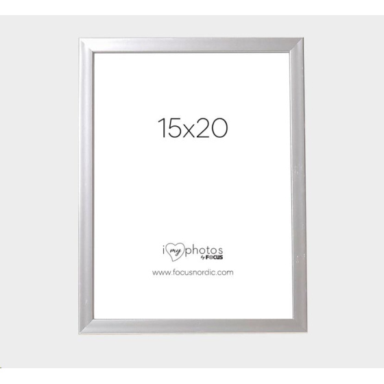 Stříbrný obrouček s tenkým profilem. Obrouček je vyrobený z plastu. Rámeček se dodává se skutečným sklem, které na fotografiích zvýrazní to nejlepší. Se stojánkem vzadu, který umožňuje umístit rámeček na polici nebo stůl. Profil rámečku má hloubku 13 mm a šířku 13 mm. Velikost obrázku v rámečku je 15x20 cm.