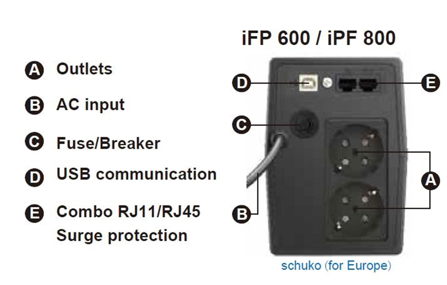 Počet výstupních zásuvek:2; Použití:Desktop; Provedení:Tower; Zdánlivý výkon VA:800; Topologie:Line-Interactive; Fáze (Vstup/Výstup):1:1; Komunikace:USB; Možnosti:Výstupní zásuvky SHUKO GR (vidlice); Typ výstupu:SCHUKO; Ochrana telefonní sítě; Ochrana datové sítě.Více