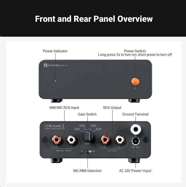 Fosi Audio BOX X5 je phono předzesilovač navržený pro gramofony s přenoskami typu MM i MC. Dokáže převést slabý signál z gramofonu na úroveň použitelné linkové úrovně, čímž umožní připojení k běžným zesilovačům, aktivním reproduktorům nebo HiFi systémům bez vestavěného phono vstupu. Díky precizní RIAA korekci přináší vinylovým deskám bohatý, čistý a dynamický zvuk.