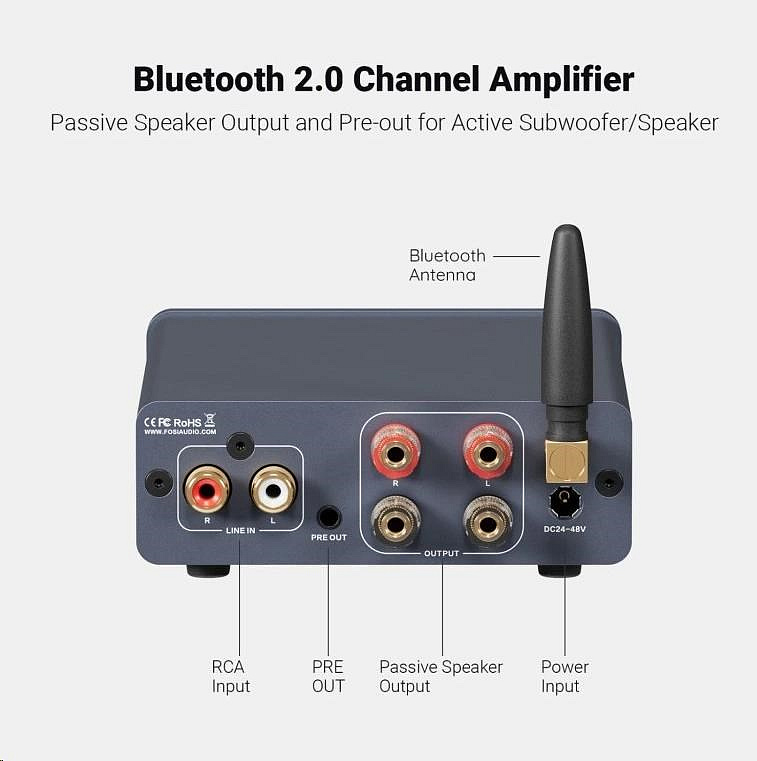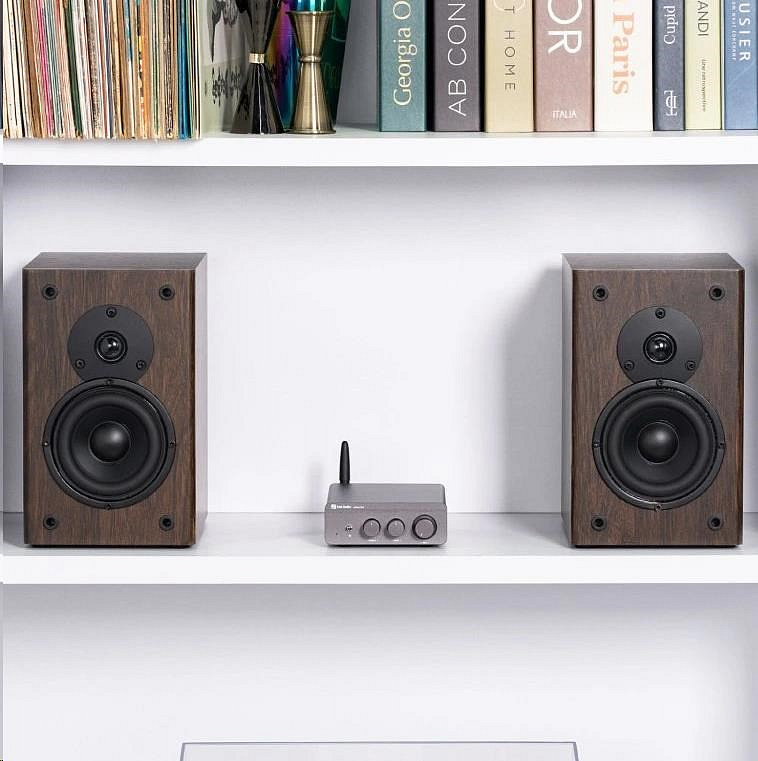 Kompaktní Bluetooth stereo zesilovač 2.0. Výkonný, čistý zvuk, jednoduché ovládání, robustní konstrukce pro moderní domácí HiFi.