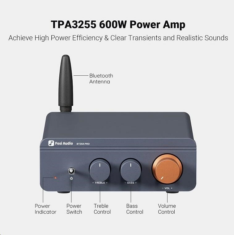 Fosi Audio BT20A Pro je moderní stereo zesilovač třídy D navržený pro domácí HiFi a desktopové audio systémy. Kombinuje vysoký výkon s kompaktním provedením, jednoduchým ovládáním a bezdrátovým připojením přes Bluetooth. Ideální pro uživatele, kteří chtějí kvalitní zvuk bez složitosti velkých receiverů.